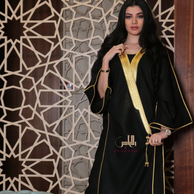 بشت نسائي فاخر بتصميم عباية بأكمام فضفاضة مصنوع من قماش اللينين الفاخر ، ومصنوع من الزري الذهبي ، مع طرحة مزينة بالزري من الأطراف .